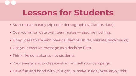My IMC Guest Speaker Presentation. As the first place team from last semester, our group came back to this year's IMC Class to offer valuable tips and advice to students for this semester's class.